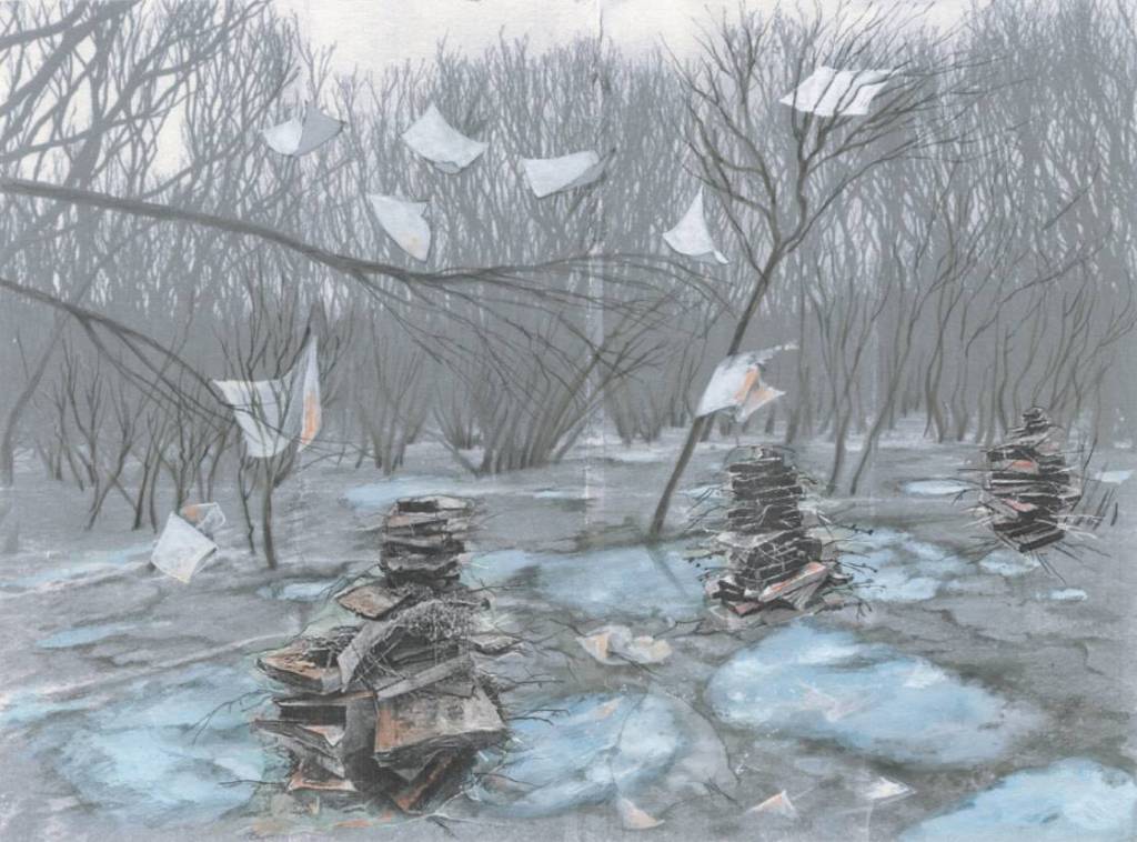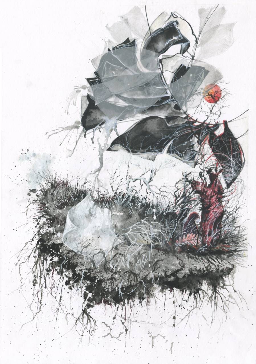 Curled away amongst swarming fly ash.