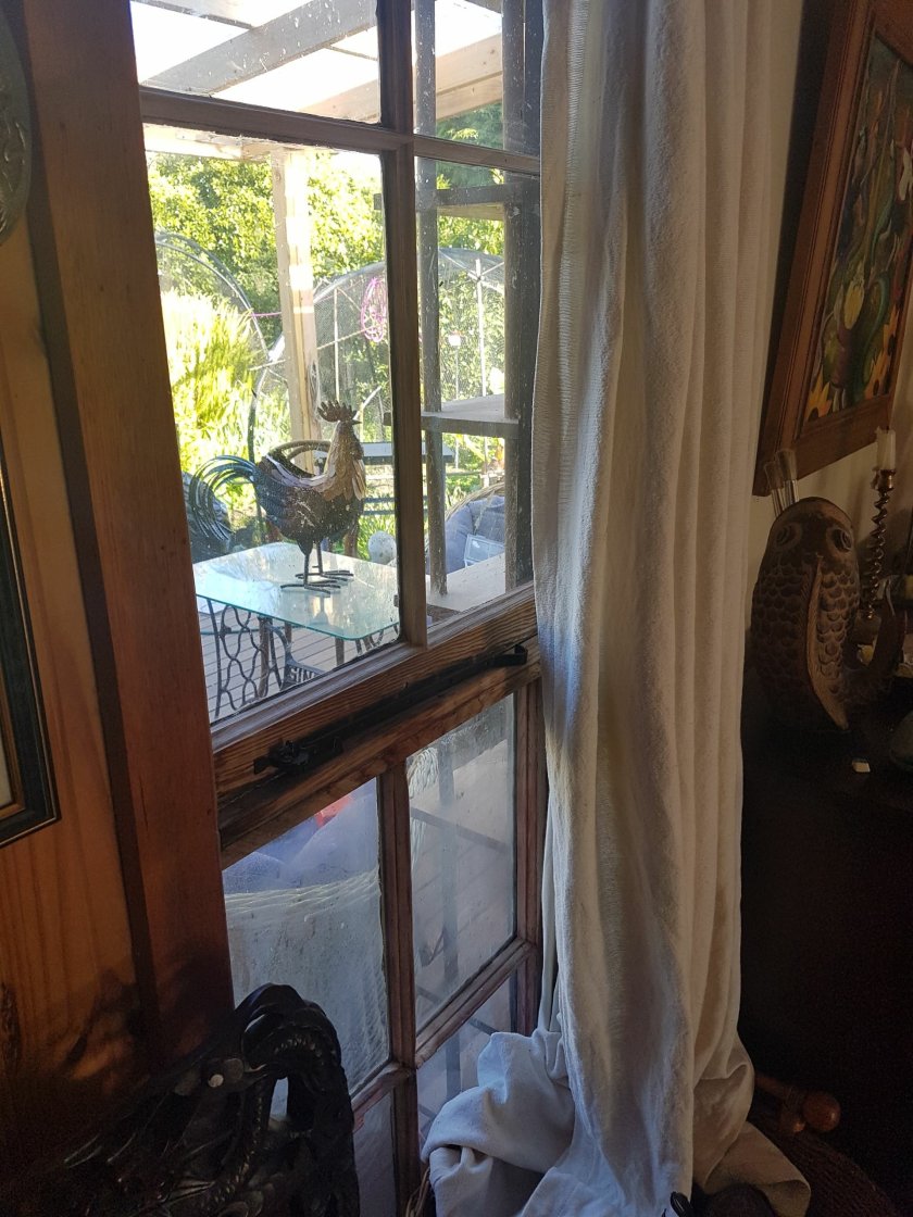 Shone through clacking curtain beads.